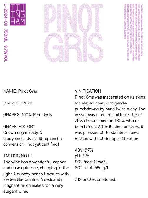 Pinot Gris was macerated on its skins for eleven days, with gentle punchdowns by hand twice a day. The vessel was filled in a mille-feuille of 70% de-stemmed and 30% whole-bunch fruit. After its time on skins, it was pressed off to stainless steel. Bottled without fining or filtration.